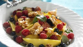 Skær mango i både og anret som bund med mynteblade og kom resten af frugten over. Dryp med citronsaft.