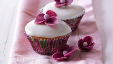 Rør smør, sukker og revet marcipan blødt og cremet og pisk herefter æggene i ét ad gangen. Sigt hvedemel og bagepulver i dejen og rør det sammen med mælk. Fordel dejen i muffinsforme og bag kagerne ved 175° i 20-25 min. Mærk efter med en gaffel, om kagerne er bagt. Afkøl kagerne på en bagerist og pynt med hvid glasur og blomster udstukket af marcipan og med en lille kugle hvid marcipan i midten.