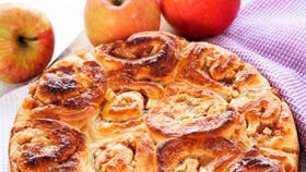 Rør gæren ud i den lunkne mælk, rør 120 g hvedemel i og lade det hæve ca. 15 min. Rør æblejuice, sukker, smør, salt og næsten alt melet i. Ælt dejen med det sidste mel, til den er smidig, glat og slipper skålen. Del dejen i to og rul hver del ud i en firkant på størrelse med et A4-ark. Bland ingredienserne til fyldet sammen og fordel det på dejen. Rul dejen sammen på langs til en roulade og skær hver roulade ud i 10-15 stk. Læg dem i to smurte forme på ca. 22-24 cm. Lad dem efterhæve i ca. 30 min. og pensl dem med sammenpisket æg. Bag kagerne nederst i ovnen ved 200º i ca. 30-35 min.