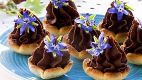 Drys lidt flormelis ud på bordet, så marcipanen ikke hænger i. Rul marcipanen ud og udstik kager på 5 cm i diameter. Brug evt. et lille glas til at udstikke med. Form dem til små skåle og stil dem omvendt på en papirbeklædt bageplade. Lad dem stå et par timer eller natten over. Bag skålene ved 200° i 5-6 min. Kog fløden op og kom den hakkede chokolade i, rør til en jævn creme. Lad trøffelmassen afkøle, rør i den af og til. Smag evt. til med cognac. Kom trøffelmassen i en sprøjtepose og kom lidt trøffelmasse i hver skål.