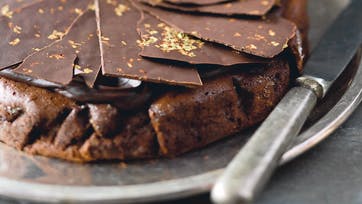 Smør chokoladecremen på den kolde kage og pynt med chokoladepladerne.