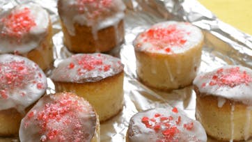 Glasur af flormelis og vand, evt. med lidt rød frugtfarve eller knuste, røde bolsjer