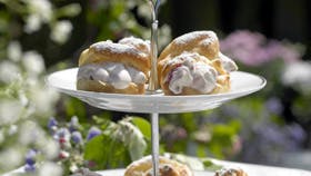 Lun fløden, tilsæt chokoladen og rør blandingen sammen til en ensartet masse. Stil chokolademassen på køl i mindst 3 timer. Smelt smør, vand og sukker op i en gryde og pisk melet i. Lad dejen koge sammen, mens der røres, til den slipper gryden. Tag dejen af varmen og lad den køle lidt. Rør æggene i et ad gangen og rør, til dejen bliver glat og skinnende. Sæt dejen som små toppe på en bageplade med bagepapir og bag dem ved 175° i 20 min. Udsten kirsebærrene og hak dem groft. Pisk den stive chokolademasse op til en luftig creme og vend kirsebærrene i. Halver vandbakkelserne og læg en skefuld creme i hver. Server vandbakkelserne drysset med flormelis.