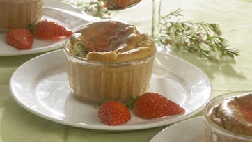 Kog mælken op med sukker og vanilje. Smelt smør og rør med hvedemel. Kog afbagningen af med vaniljemælken, til den er jævn og glat. Del æggene og rør blommerne i den afsvalede jævning sammen med blendede pistacier. Pisk hviderne i en skål for sig. Fold dem i æggemassen. Kom dem i smurte souffléforme med kant af bagepapir. Lad dem sætte sig 10 min. i køleskab. Bages ved 200° i 20 min., til den er hævet fint. Mos imens de fleste af jordbærrene med sukker og citrus og skær de sidste i skiver. Kom over soufléen ved servering.