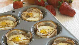 For muffinsformene med bacon. Læg en kugle staniolpapir i midten, så det holder, og forsteg bacon i ovnen ved 220° i 5 min. Tag ud og afkøl. Slå et æg ud i hver form, når du har fjernet alufolien. Sæt fadene i ovnen ved 170° 8 min., til æggene er smilende. Drys med hakket purløg og peber ved servering.