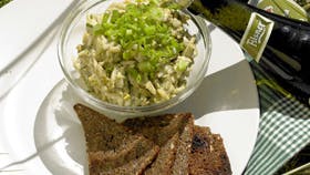 Hak æggene fint. Kog pastaen efter anvisningen på posen, skyl den i sigte og køl den af. Hæld væden fra sildene og skær dem i små bidder. Bland tingene og tilsæt mayonnaise, så det lige hænger sammen. Rør purløg i og smag til med karry, salt og peber.