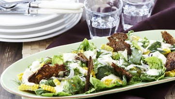Bælg ærterne. Kog majskolberne i ca. 8 min. i saltet vand og skyl dem under koldt vand. Tag en skarp kniv og skær alle majskernene af kolberne. Snit det pillede skalotteløg i tynde skiver og vend dem med citronsaften og groft havsalt til dressingen. Lad dem trække i 10 min. Skær rugbrødet og rist skiverne sprøde i ovn eller på rister. Rør mayonnaise med karry, tykmælk, olie og lagen fra løgene. Smag til. Dressingen må ikke være for tyk. Anret de tørre salatblade med majs, ærter, dild og løg og hæld dressingen over i tilfældige klatter og pynt med rugbrødsskiverne.