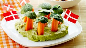 Avocadoerne skrælles, udstenes og blendes med citronsaft, salt og peber. Bredes ud på 3 tallerkner. Gulerødderne skrælles og skæres i 3 stykker. Hvert stykke skæres i 4 stave og hver stav sættes i avocadomarken. Øverst lægges 3 små skyllede spinatblade på hver gulerodsstav. Måske kan børnene ikke lide spinaten, men så kan de pille den af og dyppe gulerødderne i avocadoen.