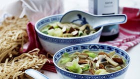 Skær champignonerne i halve. Steg dem på en meget varm og tør pande i ca. 4 min. Skær blomkålen i bittesmå buketter. Bring bouillonen i kog, tilsæt sojasauce, nudler og blomkålsbuketter og lad det koge i 5 min. Rens forårsløgene og skær dem i skiver på skrå. Snit spidskålen fint. Fyld begge dele i suppen sammen med champignonerne. Rør rundt i suppen, skru ned for varmen og lad den småkoge i yderligere 5 min. Tilbehør: Hak mandlerne og drys dem over suppen. Server straks, mens suppen stadig er rygende varm.