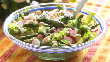 (4 pers.)50 g hasselnøddekerner14-16 grønne asparges4-6 stk. hvide asparges2-3 håndfulder fintsnittet romainesalat el. 1 bakke rucola10 radiser1