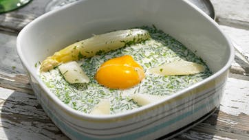 Kom løg og suppe i en gryde og bring i kog. Skræl asparges og kom skrællerne i suppen. Lad det koge i 10 min. under låg. Si suppen. Kom suppen tilbage i gryden. Kog de skrællede asparges i suppen i 6 min. Tag dem op og skær den nedre del i mindre stykker. Hak krydderurterne. Kom vin, krydderurter og fløde i suppen og pisk. Smag til med salt og peber. Bring til kogepunkt og læg de små stykker asparges i suppen. Anret med de pæne, lange hovedstykker og læg lige før serveringen en nyudslået æggeblomme i hver tallerken. Spises med brød til.