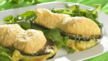 Skær auberginerne i "skosåler" og salt dem 1 time, dup dem tørre. Pensl med lidt olie og grill under ovngrill i 10-15 min. Sauter løg i smør, bag af med melet og jævn med mælken. Smag til med ost, salt, peber og citron og leger med æggeblomme. Læg halvdelen af aubergineskiverne i et ovnfast fad og hæld massen over. Læg låg på. Pisk æggehviden stiv og læg over låget og drys med ost. Stil i ovnen ved 200° i ca. 15 min.