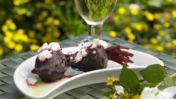 Børst rødbederne under koldt vand. Lad rodspidsen og nogle cm af stilkene blive siddende. Kog rødbederne 10 min. i letsaltet vand, til de næsten er møre (kan gøres dagen før). Læg rødbederne (evt. halverede, hvis de ikke er små) i portionsforme og drys med salt. Dryp 1 spsk. honning over og smuldr 100 g blød gedeost over (eller hvidløgsost). Slut af med nogle kviste timian. Bages i ovnen 8 min. ved 225°. Serveres til forret lune med godt brød.