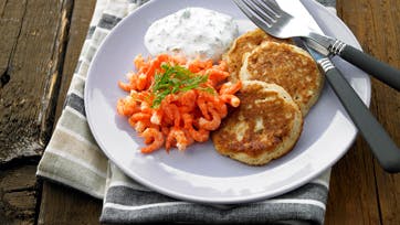 Skyl rejerne i koldt vand og kog vandet op med salt. Hak dildtoppen, vend den i cremefraichen sammen med citronsaft og smag til med salt og peber. Kom dildstilkene i det kogende vand sammen med rejerne og lad dem koge i 5 min. Lad rejerne trække i kogevandet i 20 min. og pil dem, mens de er lune.