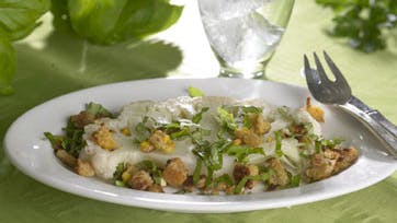 (2 pers.)1 blomkålshoved, ca. 400 g2 æg1 lille porre2 skiver hvidt brød25 g smør ½ dl strimlet basilikum1 spsk. dijonsennepSaltGroftkværnet peberRens