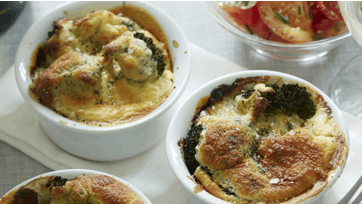 Kom broccolien i små, smurte, raspede gratinskåle hæld æggemassen over og bag dem ved 180º i 25 min., til massen er luftig og kan holde faconen.
