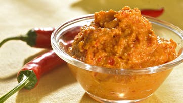 Flæk chilien og fjerne kerner og mellemvægge. Hak chili, peberfrugt og hvidløg i lidt mindre stykker. Kom dem i blender eller hurtighakker sammen med nødder og citronsaft. Lad maskinen køre, til det er finthakket. Tilsæt olie og kør, til det er cremet. Smag til med salt. Cremen kan holde sig 4-5 dage i køleskab.