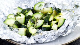 Skær courgetter i tern og ryst dem i plastpose med olie og salt. Læg dem i alufolie sammen med hele, upillede hvidløgsfed. Læg pakkerne på grillen sammen med kød eller kylling i