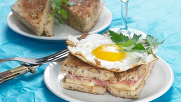 Smør brødet med et tyndt lag smør og sennep og tryk skiverne sammen med skinke. Gratiner i ovnen ved 225° 8-10 min., til osten begynder at smelte.