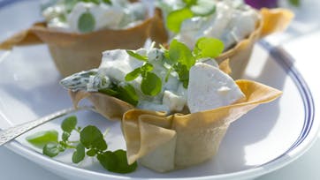 Pensl 8 huller i muffinsforme med olie. Pensl det ene ark fillodej med olie og læg det andet oven på. Skær dejen i tern, ca. 10 x 12 cm. Tryk dejen ned i formene og pensl med resten af olien. Bages midt i ovnen ved 175° 8-10 min. Kog kyllingefileterne i bouillonen ca. 8 min., og lad dem køle i bouillonen. Knæk det nederste af aspargeserne og skær dem i 4 cm lange stykker. Kog dem 3-4 min. og køl dem under koldt vand.