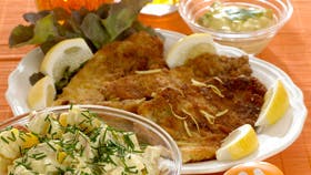 Alle ingredienser til remouladesovsen røres sammen i en serveringsskål og smages til. Fisken vendes i mel med salt og peber, så i sammenpisket æg og så i rasp og steges i gyldent smør, til overfladen er sprød. Kan gøres i god tid (opbevares koldt) og lunes i ovnen.
