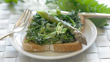 Blanchér urterne 2-3 min. i spilkogende vand og hæld dem i en sigte. Skyl dem under koldt vand og lad dem dryppe helt af, hak dem med en kniv. Rist brødet. Svits urterne i en lille gryde i smør. Hæld fløden ved og lad det koge ind. Smag til med citronsaft, salt og peber. Læg urteblandingen på brødet. Pynt med asparges og evt. ramsløgsblomster.