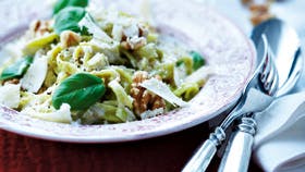 Servering: Vend den varme pasta sammen med valnøddepestoen og anret pastaen på varme tallerkner. Top med friskhøvlet parmesanost, basilikumblade og grofthakkede valnøddekerner og server straks.