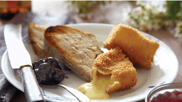 Rist brødet. Vend osten i sammenpisket æggeblomme og i rasp. Varm olien og frituresteg osten, til skorpen er lysebrun. Server osten varm med ristet brød og solbærsyltetøj til.