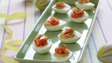 Kog æggene i 8 min. og lad dem afkøle i koldt vand. Pil æggene og halvér dem på langs. Tag forsigtigt blommerne ud og mos dem med smør, cremefraiche og karry. Smag fyldet til med dild, salt og peber. Kom fyldet i en sprøjtepose og fyld det i æggene. Pynt med krebsehaler og dild og servér med groft rugbrød.