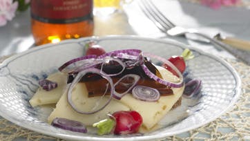 Smør brødet med fedt og læg osten på. Pynt med sky og løgringe. Ved servering hældes rom over, og man kan evt. give nogle radiser til. Men ikke noget med frugt eller rød peber.