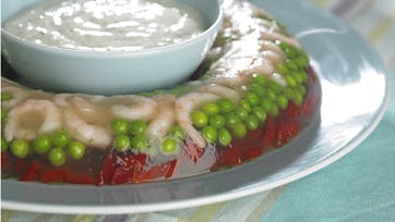 Læg husblassen i blød i koldt vand. Skyl en 1-liters randform med koldt vand og fordel rejer, dild, ærter og peberfrugter. Varm bouillon og hvidvin op og smelt husblassen deri. Lad bouillonen afkøle lidt og hæld den over fyldet i randformen. Stil randformen tildækket og koldt i mindst tre timer, gerne til næste dag. Rør en sovs af syrnet fløde, sennep, dild, kapers og citronskal og smag til med salt og peber. Server med et godt stykke brød.