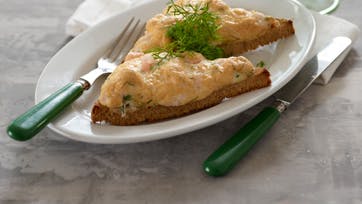 Pisk 1 æggehvide stiv med lidt salt, bland 1 spsk. mayonnaise, ca. 75 g rejer, lidt paprika og snittet dild i, og læg blandingen på 2 stk. brød. Gratiner højt oppe i ovnen ved 250° 3-4 min. og spis dem nylavede.