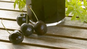 Udsten kirsebærrene og hak dem groft med en kniv eller klip dem groft. Bland kirsebær og sukker i en gryde og stil det køligt 5-6 timer, til det safter. Bring det langsomt i kog og kog bærrene sagte 15 min. under låg. Bland Melatin og sukker og rør det i. Lad det koge 2-3 min. Tag gryden fra varmen og tilsæt krydderurter. Hæld marmeladen på skoldede glas og opbevar den køligt eller tilsæt konserveringsmiddel.