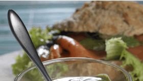 Blend sennep, sennepspulver, eddike, sukker, soja og klippet dild i en foodprocessor eller med en stavblender. Tilsæt olien lidt ad gangen, mens der blendes, til sovsen har en passende tyk konsistens. Smag til med sukker og server.