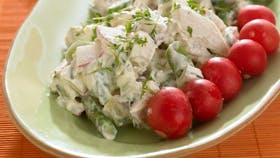 Rens aspargesene og blancher dem i 1 min. og skær dem i skrå stykker. Bland herefter alle ingredienserne, rør dressingen og smag til, når det hele er blandet. Serveres med små, syltede agurker til. Spises med rugbrød eller nyristet landbrød.