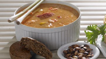 Skær skrællen af hokkaidoen og skær den i mindre stykker. Pil og hak løg og hvidløg. Svits det i smør i en gryde og tilsæt bouillon. Tilsæt knust citrongræs og 1 tsk. salt og lad suppen koge 20 min. under låg. Tag citrongræsset op. Miks suppen glat med stavblender eller i blender. Hertil kan forberedes dagen før. Skær pølse og porre i skrå skiver. Del tomaterne groft og læg dem i suppen sammen med væden. Tilsæt creme fraiche, pølse, porre, sambal oelek, limeskal og saft. Lad suppen koge nogle min. Tilsæt krebsehaler og smag til med salt og peber.