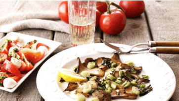 Pil og hak hvidløg. Rens svampene og skær dem i 3 mm tynde skiver. Hak timian, basilikum og persille. Snit forårsløg, lav tomatsalat med både af tomat og skiver eller kvarte mozzarellaer. Hæld pesto over og stil klar. Kom olivenolie på en pande og steg svampene lysebrune ved meget høj varme 4 stykker ad gangen. Skru ned og kom hakket hvidløg på og steg, til det dufter, men ikke er brunt. Kom krydderurter på og efter 30 sekunder citronsaften. Anret svampene på et fad og hæld krydderurtehvidløget over og dryp med mere olivenolie. Server som forret med flute.