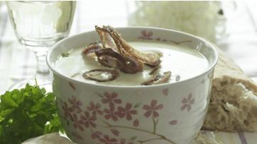 Pil løg og hvidløg og skær dem i mindre stykker. Sauter løgene i smørret, uden at de tager farve, og tilsæt persillen. Hæld bouillonen ved, og lad suppen småsimre i 10 min. under låg. Blend suppen med en stavblender og tilsæt fløden. Giv suppen et opkog og smag til med salt og peber. Skær rødløgene i skiver og vend dem i melet. Varm olien op, til den syder om spidsen af en tandstik, og steg løgene, til de er gyldne og sprøde. Server suppen med de sprøde løg og et godt stykke brød.