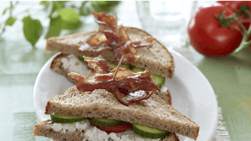 Rist baconen sprød på en tør pande og lad den dryppe af på et stykke køkkenrulle. Smør brødet med et pænt tykt lag hytteost. Skær tomaterne i skiver. Læg sandwichene sammen med tomater, agurk, baconskiver og krydderurter. Pynt med agurk og tomat.