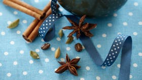 Bring vandet i kog med let knust kanelstang, kardemommekapsler og stjerneanis. Lad det koge 3 min. og sluk. Lad det trække i 10 min. Si krydderiblandingen fra og bring vandet i kog igen. Kom kaffebønnerne i en stempelkande, hæld det krydrede vand over, når det er ca. 94° varmt, og lad det trække 4 min., inden stemplet trykkes ned. Varm mælken i en mælkeskummer eller i en kasserolle og pisk den op til fyldigt skum. Hæld kaffen på 2 glas eller krus, top med mælkeskummet og drys med en blanding af kanel, kardemomme og sukker.