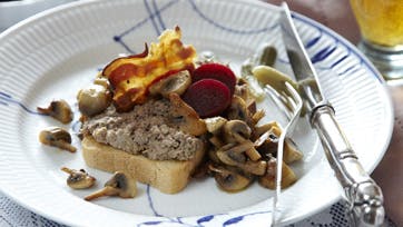 Smør leverpostejen på ristet formbrød eller rugbrød, alt efter smag. Rens svampene, skær dem i kvarte og steg dem i smør. Drys med salt og peber og hæld væden fra. Læg svampene på leverpostejen, top med ristet bacon og anret med agurkesalat og rødbede.