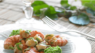 Blancher ærterne og blend dem med hvidløget til en grov mos. Rør mosen med parmesan, basilikum og yoghurt og smag til med salt og peber. Pil og rens rejerne og krydr dem og kammuslingerne med citronsaft, salt og peber. Steg rejer og muslinger i olien på en varm pande, til de er gyldne, drys med citronskal og basilikum og server sammen med ærtecremen.