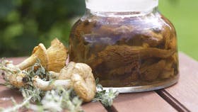 1¼ dl lys lagereddike1¼ dl æbleeddike½ dl vand125 g sukker2 kviste citron- el. æbletimian4 peberkorn3 hele allehånde100 g kantareller, rengjorte10 g