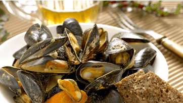 Børst muslingerne og kasser dem, som ikke lukker sig. Pil og hak hvidløg og skalotteløg fint. Skræl guleroden og skær den i tynde skiver. Varm olien i en gryde og svits muslingerne sammen med hvidløg, skalotteløg og gulerod. Hæld vinen ved. Pisk karrypasta og fløde sammen og hæld det over. Kog muslingerne under låg 3-5 min., til de har åbnet sig. Hak urterne og vend dem rundt i muslingerne. Server med rugbrødsstave, som ristes sprøde i ovnen ved 125° ca. 15 min.