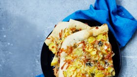 Fyld: Skær de kogte kartofler i tynde skiver og fordel dem på pizzabunden. Top med tynde skiver af blå ost og afslut med et lag revet ost. Bag pizzaen i ovnen ved 200° i 15-20 min., til den er sprød og gylden. Server gerne pizzaen med en grøn salat til.