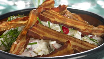 Kog kartoflerne, køl dem af og skær dem i skiver. Pil løget og hak det fint. Rens radiserne og skær dem i skiver. Bland ymer og rygeost og smag til med citronsaft, salt og peber. Rist baconen sprød. Vend kartofler og løg i saucen. Kom salaten i en skål og læg baconskiver på toppen.