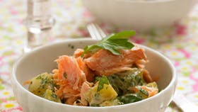 Skrub kartoflerne og skær dem i tern. Varm olie og citronsaft op på en pande. Rist kartoflerne ved jævn varme, uden at de tager farve i 5-6 min. Tilsæt salt og vend det rundt. Hæld piskefløde ved og lad den koge sammen med kartoflerne, til de lige netop er møre. Del laksen i mindre stykker. Hæld kartoflerne i to små skåle og pynt med laks.