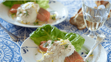 Bring vand i kog og tilsæt salt. Skær den ferske laks i fire ens stykker. Læg laksen i vandet og sluk. Lad laksen trække 8 min. i vandet. Pisk fløden til let skum og smag til med masser af friskrevet peberrod, salt, peber og lidt revet citronskal. Anret på salatblade med citronbåde og dild. Server med brød som tilbehør.