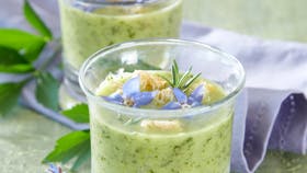 Pil og hak løg, også den grønne top. Skær agurken i mindre stykker. Svits løg og agurk i olien. Tilsæt bouillon, vand, vin, persille, rosmarin og løvstikke og kog op. Hæld blandingen i foodprocessor eller blender og kør grønsagerne til grov puré. Smag til med salt og peber. Lad suppen blive rigtig kold og spis brød til.