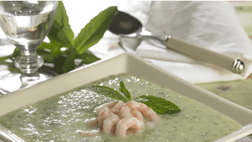 Hak agurker i mindre stykker og kør dem sammen med kærnemælk, vand og skalotteløg samt det meste af mynten (gem lidt til pynt) i en foodprocesser i mindst 2 min. Smag til med salt og peber og evt. lidt cayennepeber. Flyt den til en serveringsskål og stil på køl i to timer. Server med frisk mynte og en god håndfuld rejer i midten som en fyldig forret en varm sommeraften.